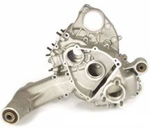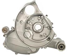 Small Frame OverviewThe small frame casing was retrofitted to be able to carry an electric start function similar to the large frame system. The difference is that the starter motor runs straight through the casing to connect to the flywheel ring gear. The only different parts that consititute the electric start system are the cases, the starter motor, and the flywheel. Everything else within the motor is the same as a non electric start motor. The cases: Standard small frame cases are shown