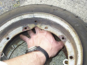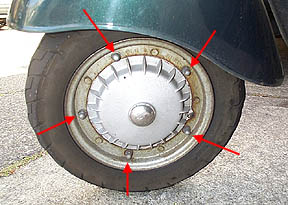 The first step is to remove the wheel and rim from the hub. The pictures below show this being done on the front wheel of a pre P-range Vespa. To remove the front wheel find the five wheel nuts on the hub side of the wheel and remove them. The tire sometimes takes a little wiggling to get it clear of the body work.