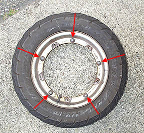Flip the tire over and remove the five 13mm nuts which hold the two steel rims together. Be aware that the two halves are different widths and the wheel must go back on the bike in the same direction. The final step in this guide shows the correct wheel/rim/hub installation.