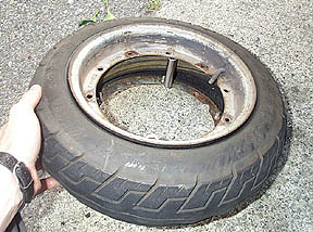 Tires - Fixing a FlatFixing a flat on a scooter is an easy project. The design of both wheels on a Vespas and the rear wheel on a Lambretta makes it very easy to remove the tire and rim to change it. On a Vespa both wheels are single sided meaning the forks or engine is on one side and the other side is free. On a Lambretta the rear tire is single sided but the front has fork connections on either side - click for a link to the Lambretta front tire change page. Also both scooters halve split rims which allows you to get access to the tube without having to get the tire off the rim like a car. Tools - You will need: