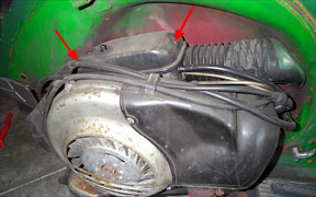 Above are two filters which mount inside the carb box. Over the years the filters have changed so if you do have to change the filter, make sure you find the correct replacement. Above is a P200E (VSX1T) and a Vespa 150 (VBA1T) filter. Basically the air filter is a wire mesh which is either directly connected to the carburetor or housed in the air box. To gain access to the filter it is necessary to remove the right hand side engine cowl. Locate the air box which is at the end of a flexible rubber intake tube. Your model may vary but apart from small frames the set up below should look familiar.