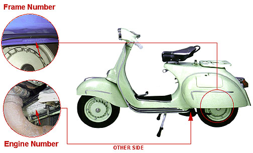 Vespa Large Frame - 60's - 70's (with fixed left hand panel glovebox) (how do I know if my Vespa is a 60's - 70's large frame?) Frame: The left hand side cowl is attached on these models and the frame serial number is stamped on the frame at the underside of the side cowl where it hits the body, above the rear wheel. The number will start with a prefix (ex. VBA1T) which denotes the model, then a star and a 4 to 6 digit number with a star at the end which denotes the year. A typical frame number may look like this: VBA1T*123456* Engine: Look on the engine swingarm to see the engine serial number. It is stamped on the cast aluminum swingarm right behind the exhaust stub on the barrel. The number will start with a prefix (ex. VSE1M) which denotes the model, then a star and a 4 to 6 digit number with a star at the end which denotes the year. A typical engine number may look like this: VBA1M*123456*