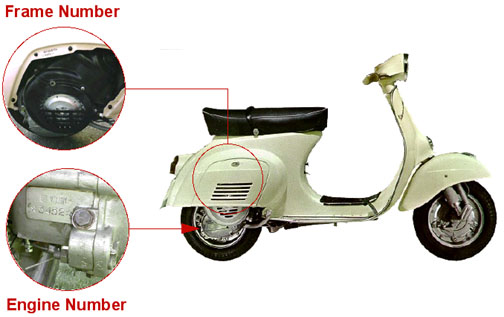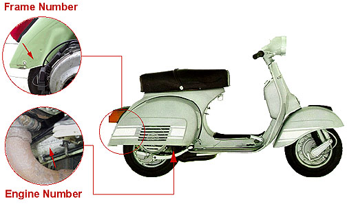 Vespa Serial Number LocationsVespa Large Frame - 70's onward (& 60s bikes with removable left hand side cowls) (how do I know if my Vespa is a 70's large frame?) Frame: The engine side cowl must be removed to see the frame serial number. It is stamped to the right of the hole for the cowl pin. The number will start with a prefix (ex. VSX1T) which denotes the model, then a star and a 4 to 6 digit number with a star at the end which denotes the year. A typical frame number may look like this: VSX1T*123456* Engine: Look on the engine swingarm to see the engine serial number. It is stamped on the cast aluminum swingarm right behind the exhaust stub on the barrel. The number will start with a prefix (ex. VSE1M) which denotes the model, then a star and a 4 to 6 digit number with a star at the end which denotes the year. A typical engine number may look like this: VSE1M*123456*