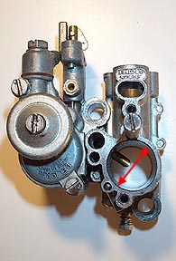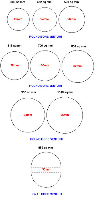 Carburetor - GeneralThe standard carburetors on both Vespas and Lambrettas are perfectly suited for what they do. The later Vespa model even allows for mixing of gas and oil right in the venturi. But when an engine has the capability to burn more gasoline there is a point at which the standard carb must be re-jetted or replaced to let more air/gas into the cylinder. This section is intended to give a very basic intro into carburation and what affects it can have on a motor. I have only had experience with a couple of engines and carbs but it should serve as a starting point. To start with, carburetors are usually referred to with a millimeter dimension. This dimension is the size of the venturi, which is where air and gasoline are mixed. Below is a shot of a typical SI24/24E carb off a Vespa P200E. The arrow shows the diameter of the circular venturi which is 24mm. Most tuned bikes can take advantage of a larger venturi to allow more of a charge into the cylinder at each revolution. The percentage of area between different sized venturi is more complicated than simple addition. A 14mm venturi has an area of 154 square millimeters, but a venturi of 28mm (double the diameter) has an area of about 615 square millimeters - about 4 times larger. Below is a chart showing typical venturi diameters with the square millimeter area of each one noted above. It illustrates that the difference between a standard 24mm Vespa carb and an aftermarket 32mm round bore carb is close to twice the area even though it is an increase of only 8mm or 30% the 24mm diameter. I also included a cross section of an oval bore carb like the Dell'Orto VHSA 30mm. The bore is extended by splitting a circle and enlarging it as shown above with the two dashed lines. Because it is oval it is actually 1.2 times larger than a 30mm round bore carb and has a larger area than a 32mm round bore carb. If you are interested in downloading a better resolution copy of the above image for reference, click here for a .pdf file. Next Section --> |