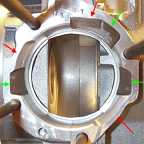 The porting work that MB Developments did is shown in the picture above. The original cast transfers are shown with green arrows, and the expansion of each one is shown with a red arrow. The Malossi kit has large openings in the spigot that now align properly and will allow a better gas flow to ports in the barrel wall. We will further this a little by polishing the ports to a fine finish.