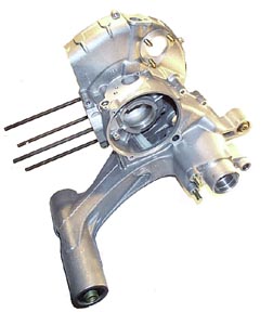 These casings came brand new with porting work done by MB Developments (Note that MB Developments don't do Vespa tuning or parts sales anymore) and shipping for less than what is charged for new non-electric start casings in the US without shipping! Although I will try opening my own ports when I get a 210 for my VBA it made more sense to have a professional tuner do it for a present for someone else. I'd also like a little practice on some dead casings before I attack brand new ones. We chose electric start casings because an electric start is quite easy to add once the casings are able to accommodate the small electric starter motor. The it is just a matter of locating a special flywheel, stator, starter motor, and rectifier, and then wiring it in. There are 3 ports in a P200 crankcase mouth but only one that is used. The left and right transfers cast into the casing are not used because the two main transfers are cast within the P200 barrel. So why are these on P200s?? I think it is because a P125 and P200 share the same initial castings but then they become different internally when they are machined for different engine sizes. The P200 barrel spigot covers these two transfers anyway so there is no detrimental effect leaving them in the casting. The upper most transfer leads to is a smaller boost port in the barrel and the transfer is visible at the mating face between the barrel and the crankcase mouth. Because of this a standard P200 base gasket only has a single cut out. The P200/Rally 200 barrel is a little funny because it is rotated off the line of the crankshaft. Most two strokes and older Vespas have the exhaust port at 6:00, and the two main transfers at 3:00 and 9:00. The P200 is rotated by about 25 degrees probably to allow the exhaust to stick out at an angle rather than straight down..at least that is my best guess.